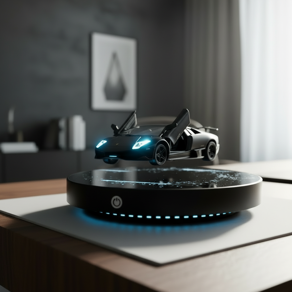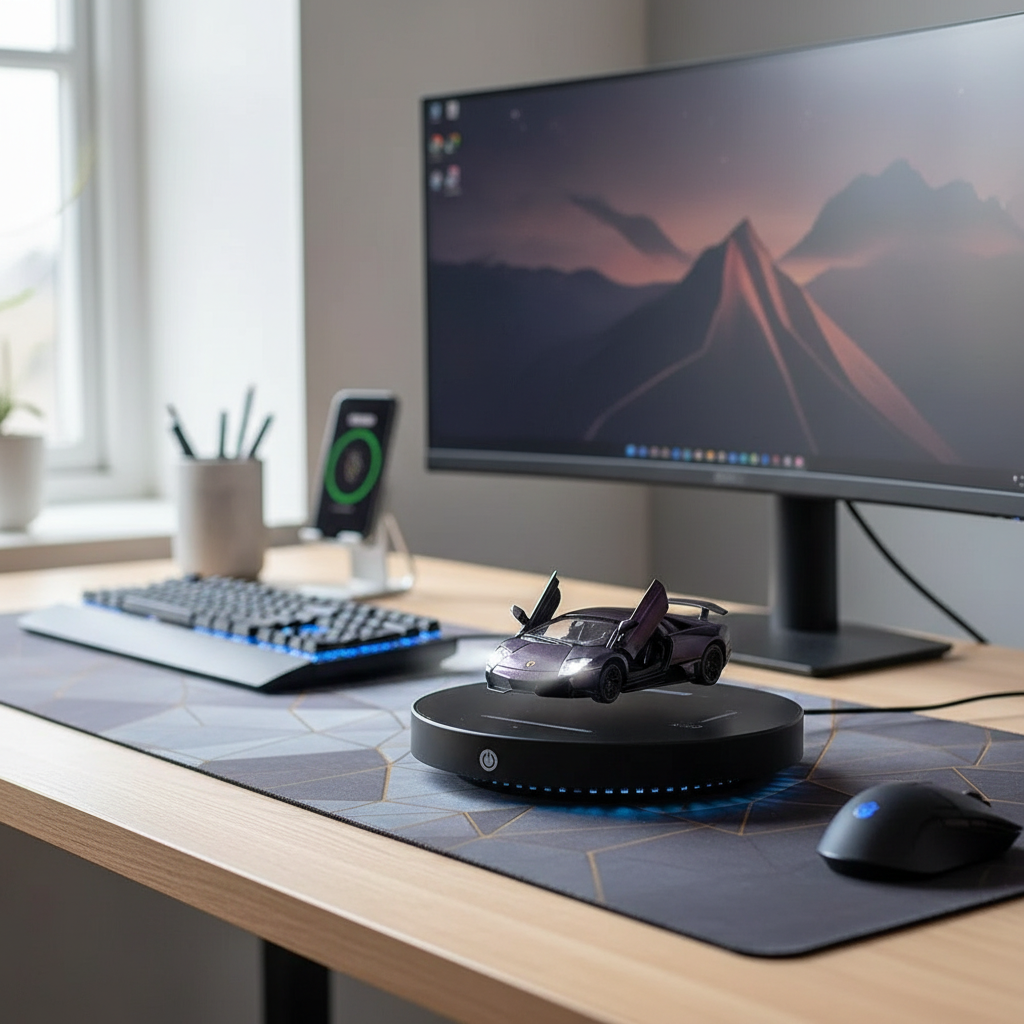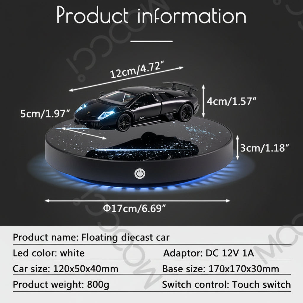 Crafted with a sleek metal base and a polished mirror-glass platform, the display projects a refined glow that enhances the floating supercar above it. Whether placed in a workspace, home office, or collector’s room, it delivers the perfect balance of engineering and artistry.